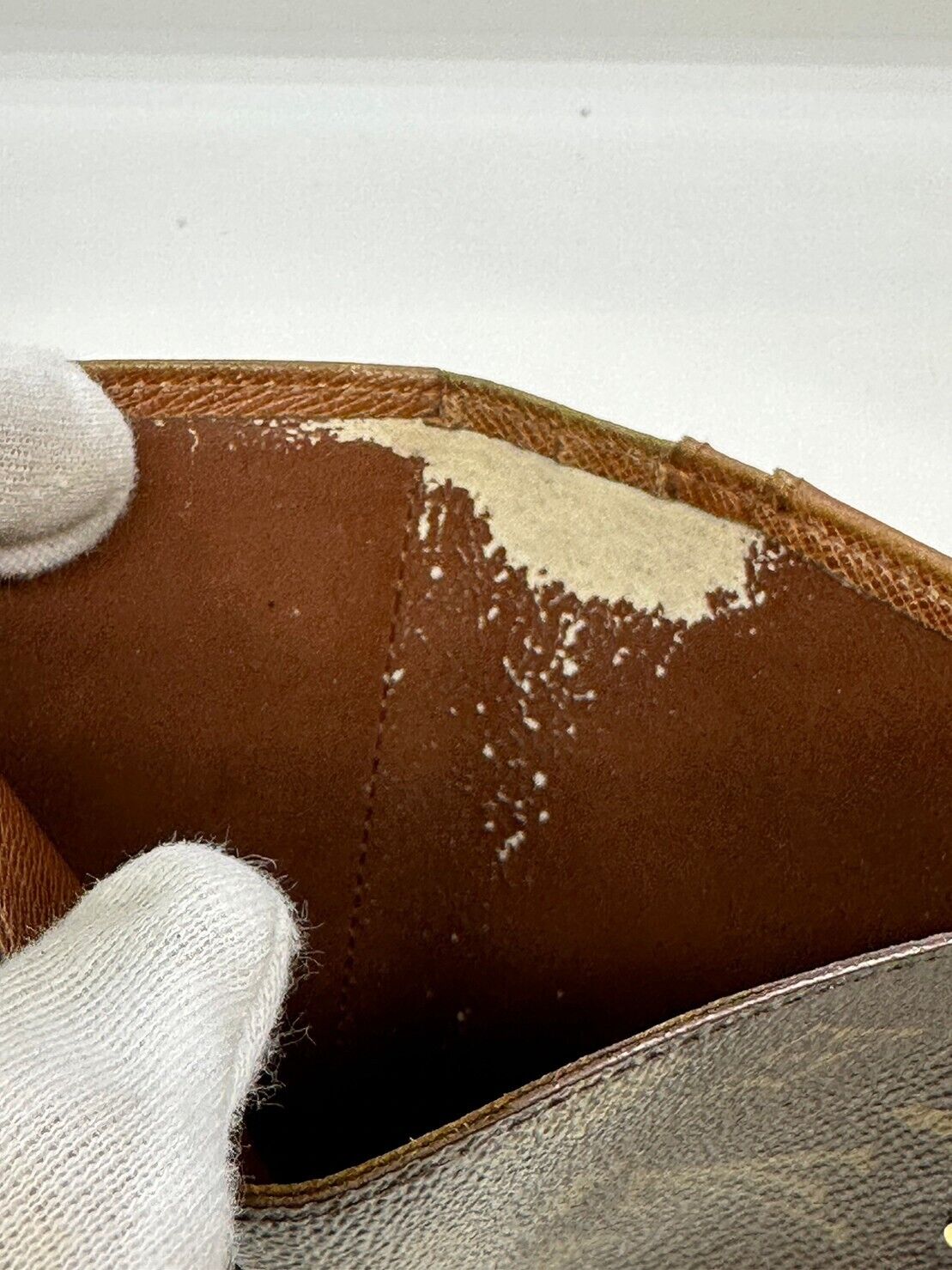 (Inside) There are peeling, stains, and scuffs on the leather.