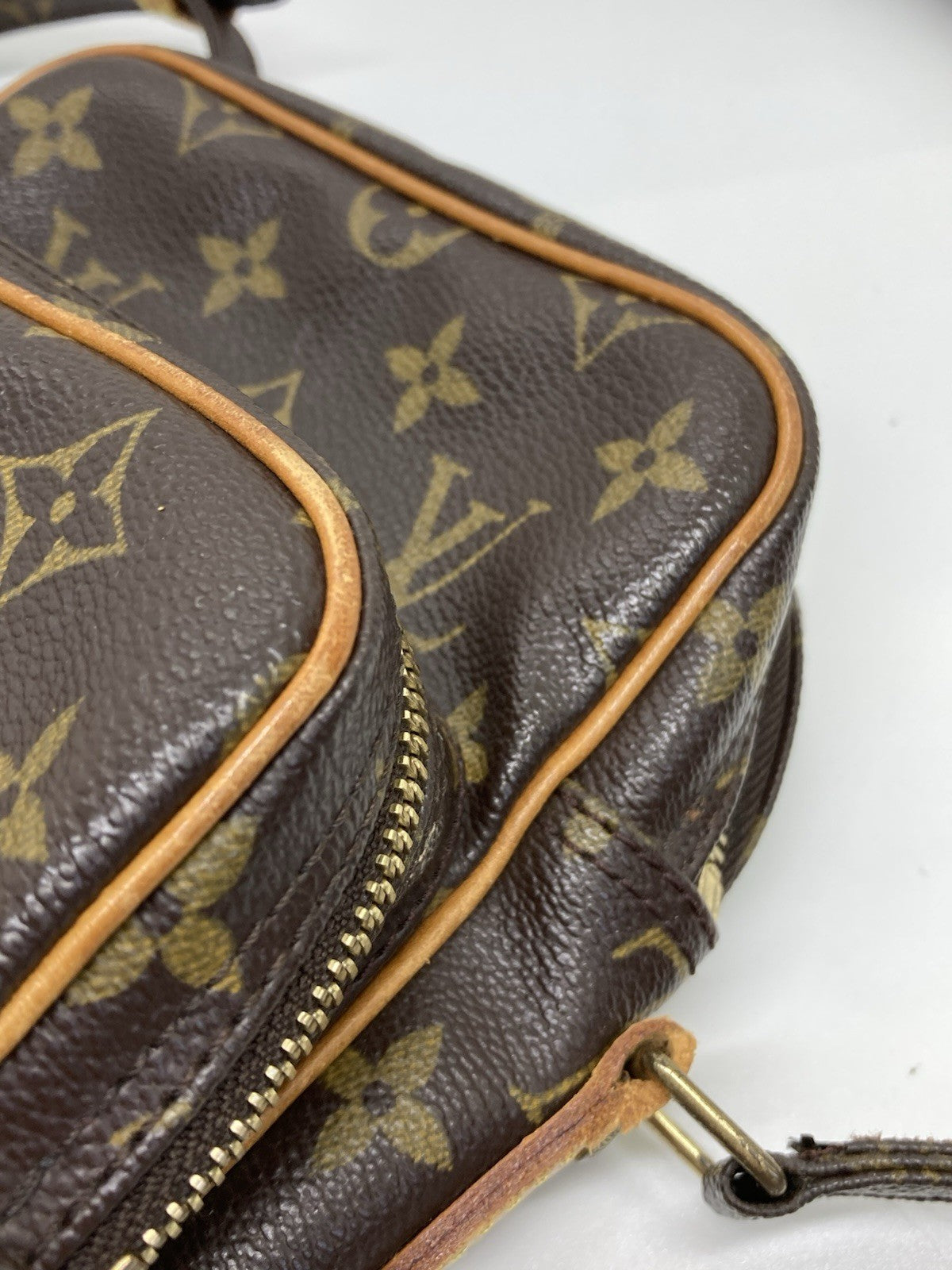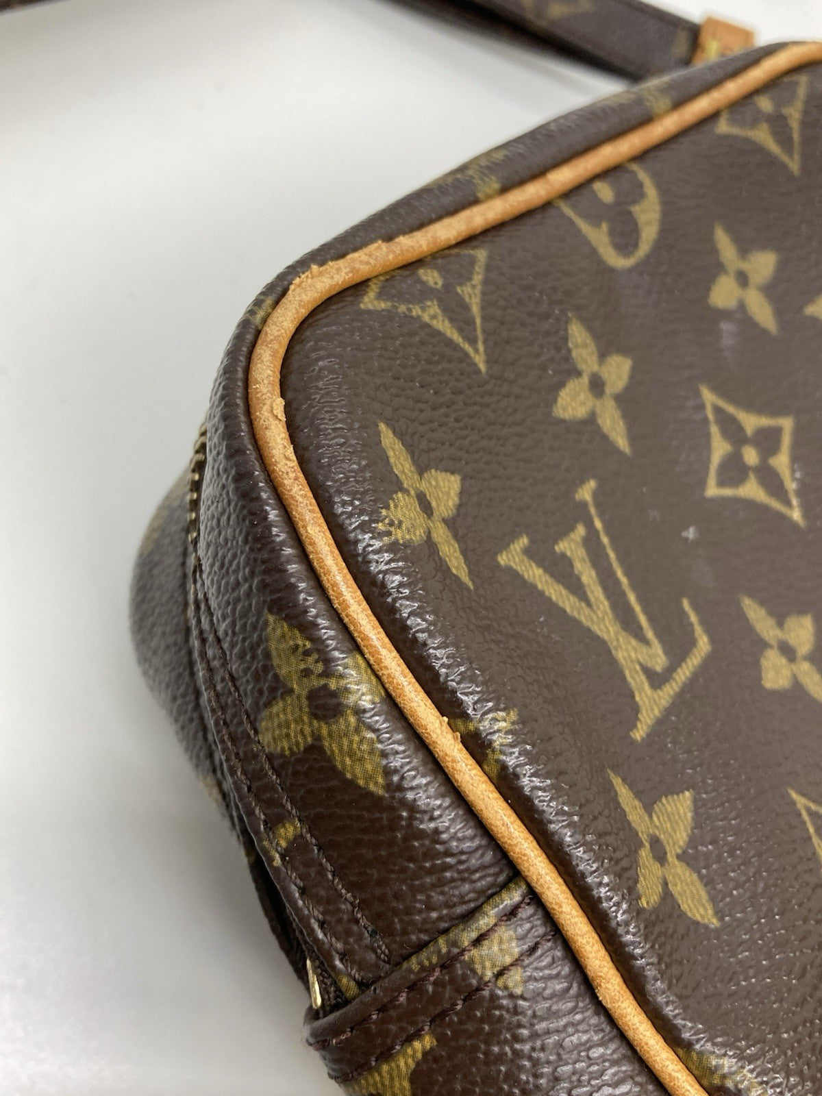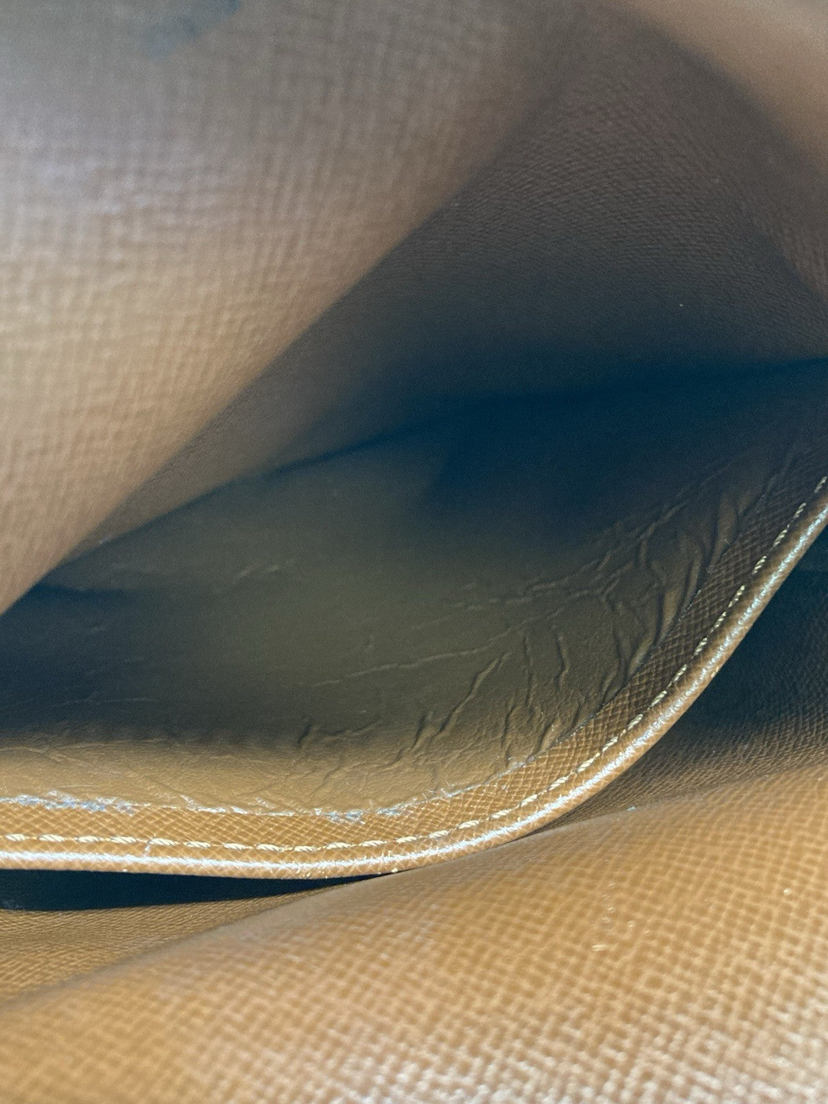 (Outside) There are slight stains.There are scuffs, peeling, and stains on the outer edges.The metal fittings are peeling, stained, and scratched.There is slight cracking on the shoulder pads. There is slight peeling on the monogram near the shoulder seam.