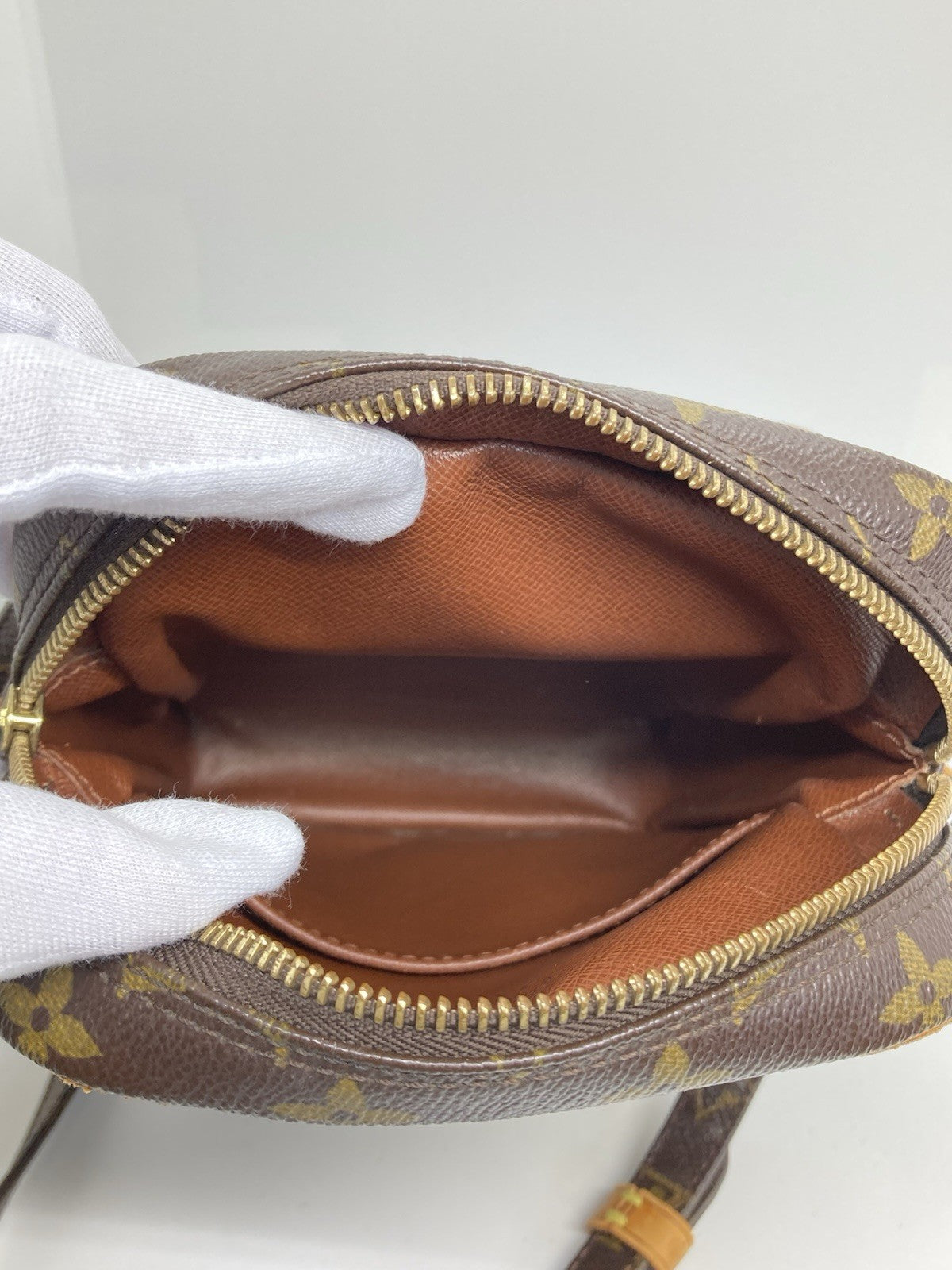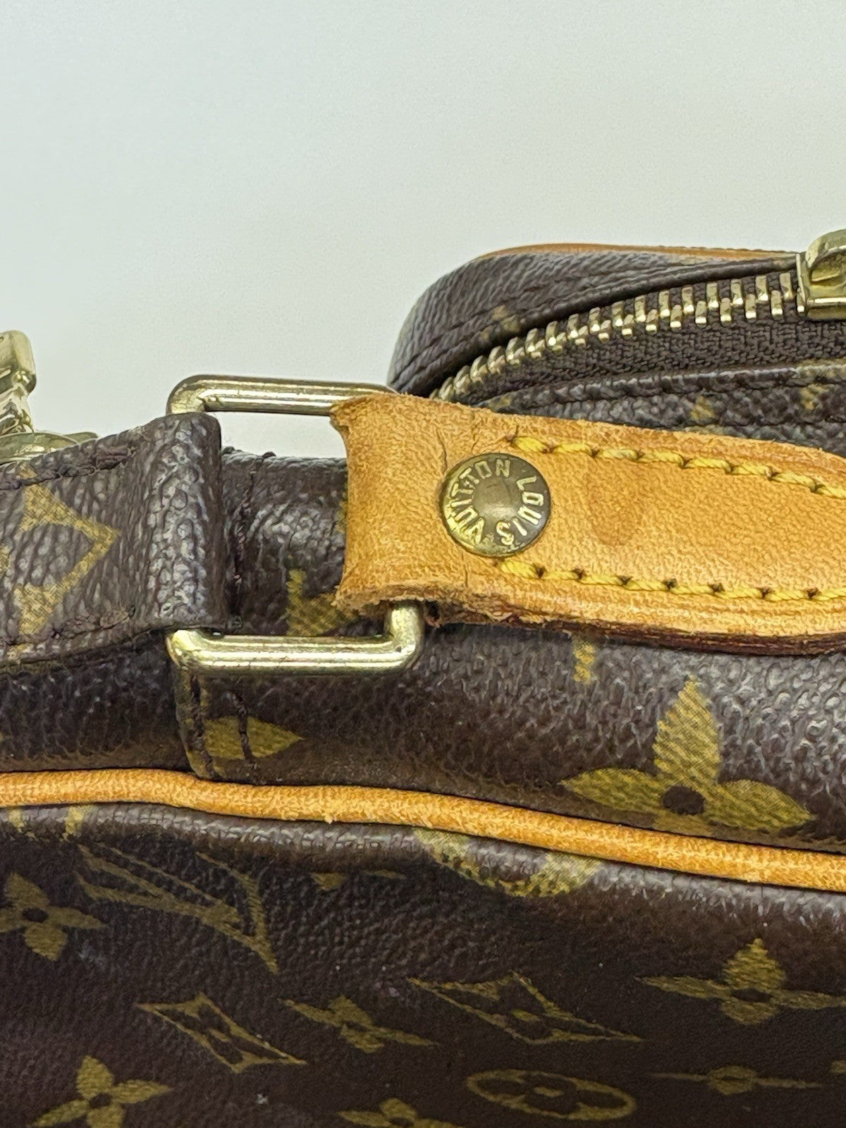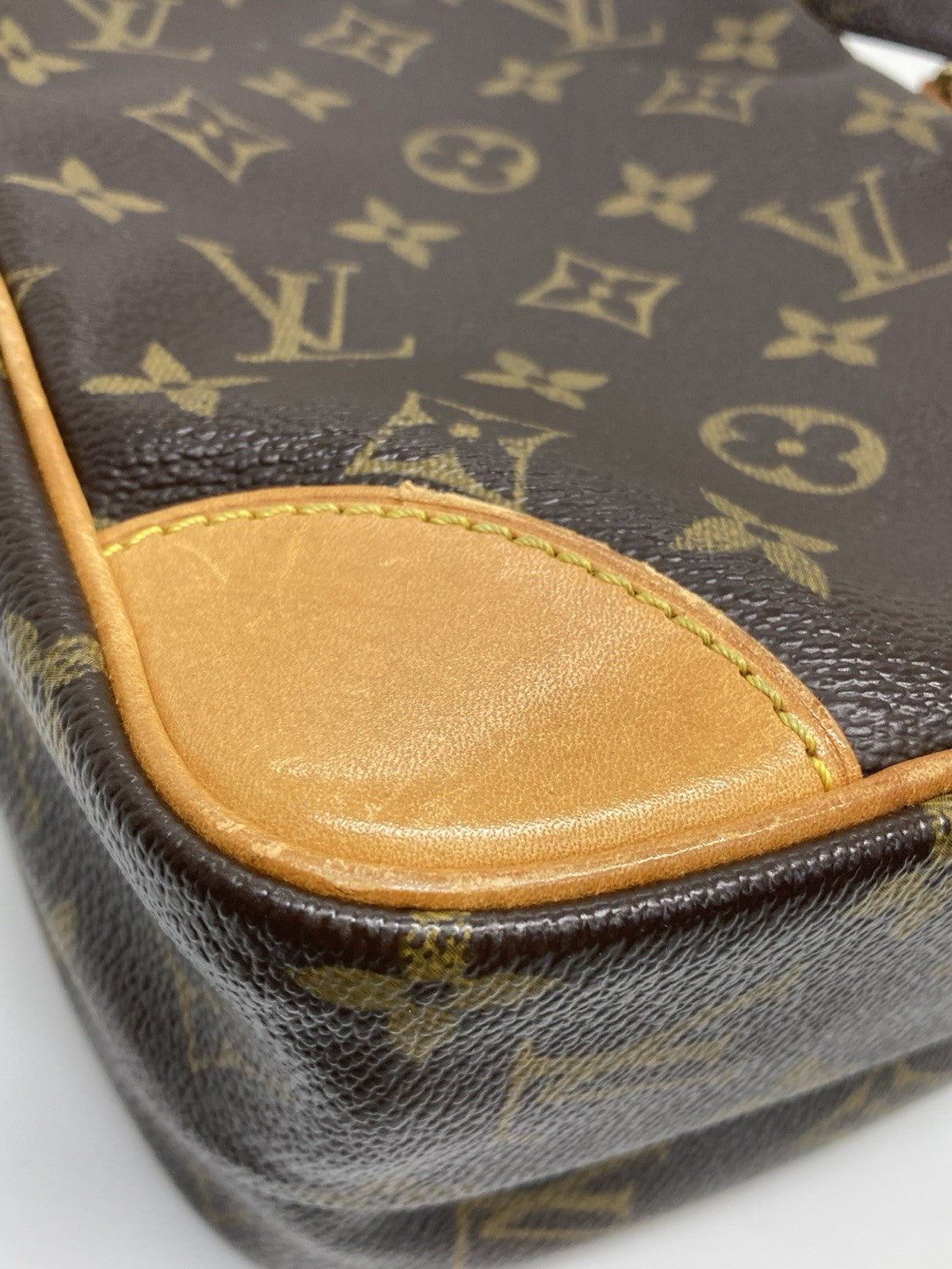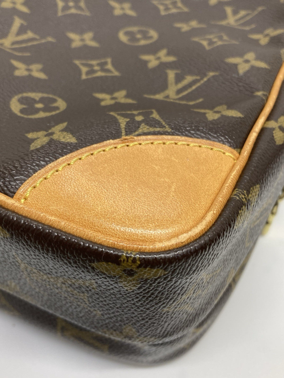 (Outside) There are slight stains.There are scuffs, peeling, and stains on the outer edges.The metal fittings are peeling, stained, and scratched.There is slight cracking on the shoulder pads. There is slight peeling on the monogram near the shoulder seam.