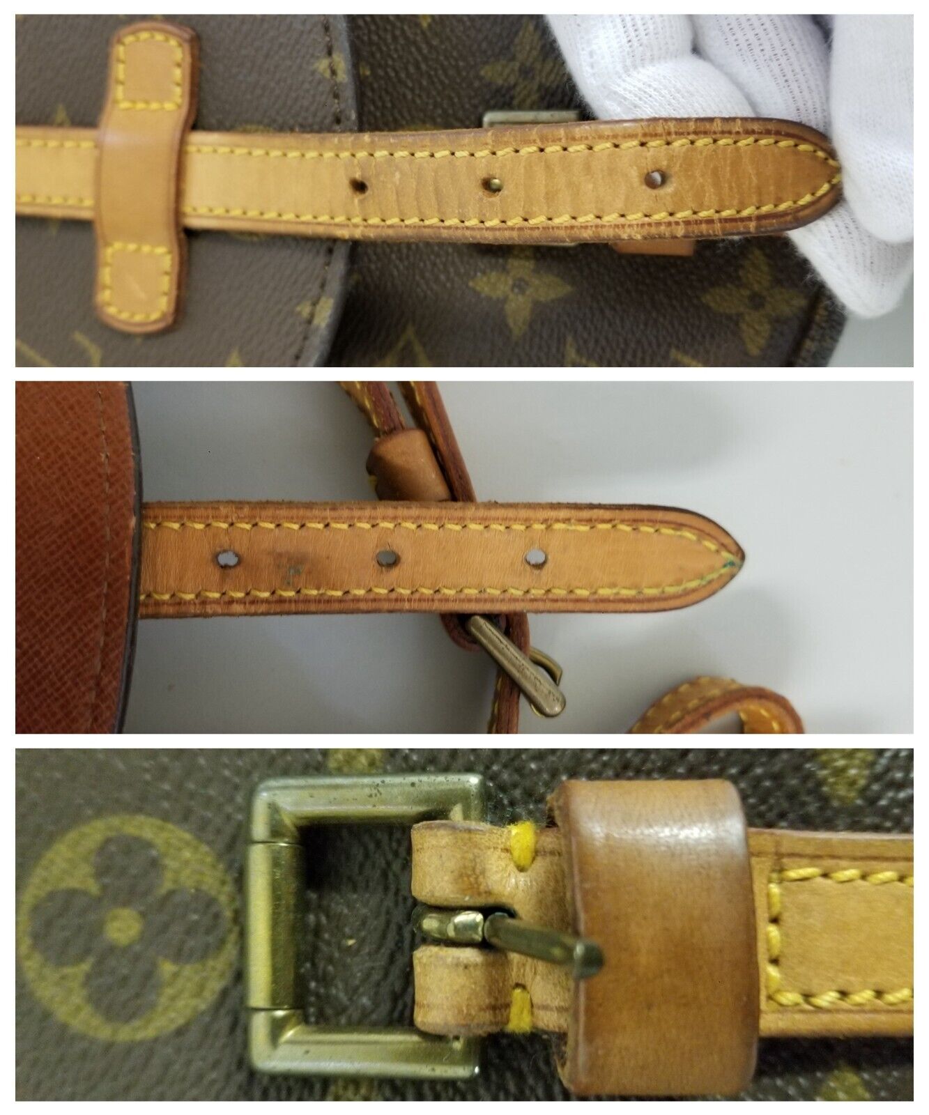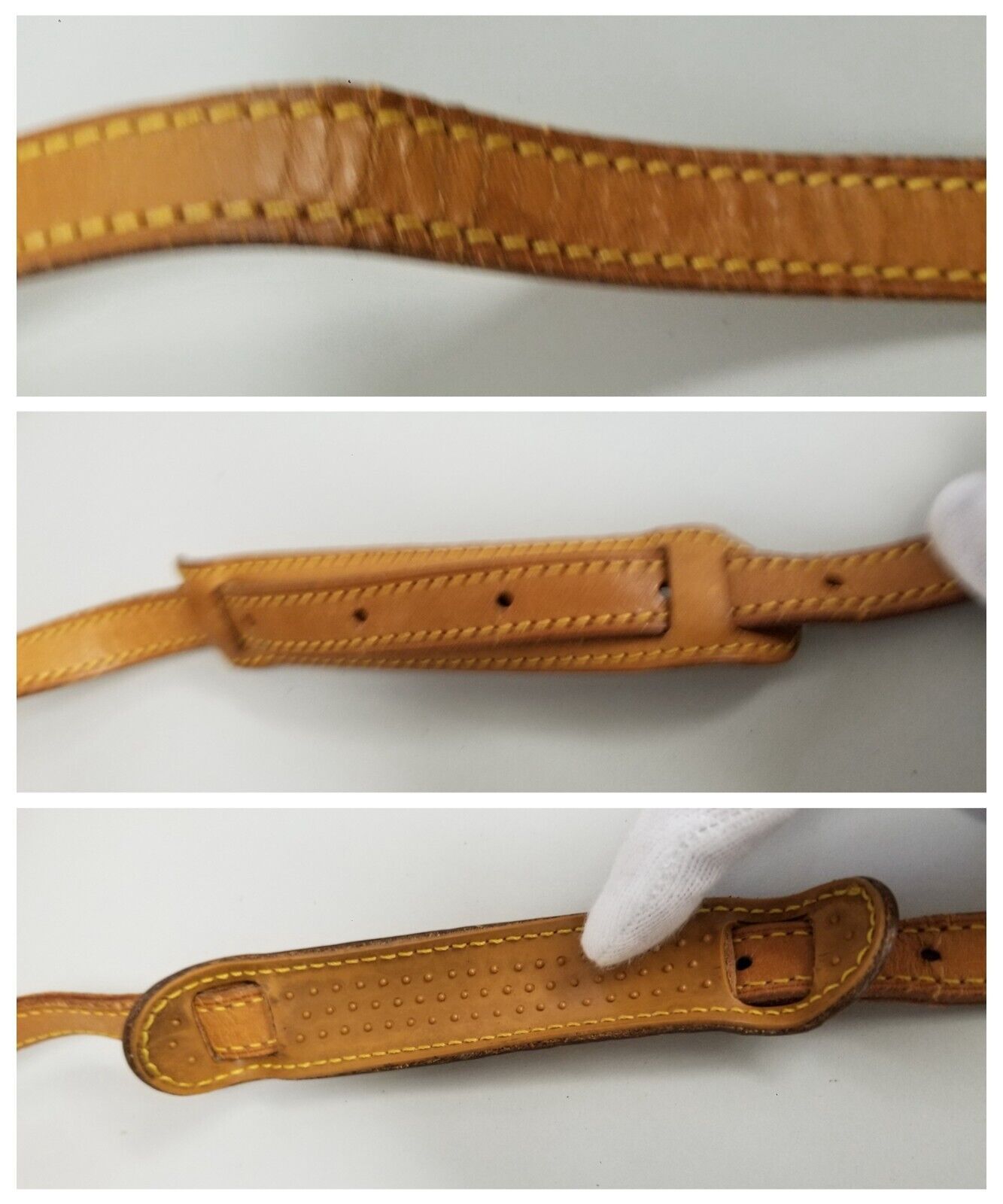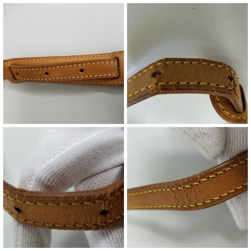 (Outside:) There are scratches, dirt, and peeling on the edges. The strap is stained, scratched, and discolored due to cracks. The metal fittings are stained, scratched, and peeled.