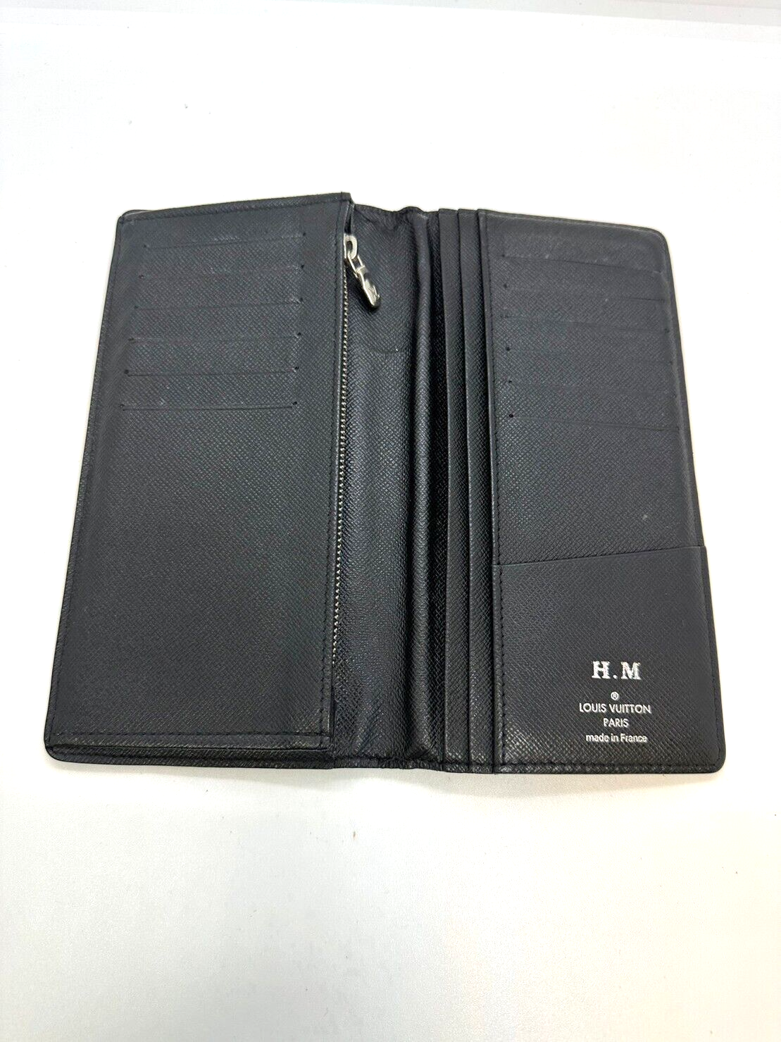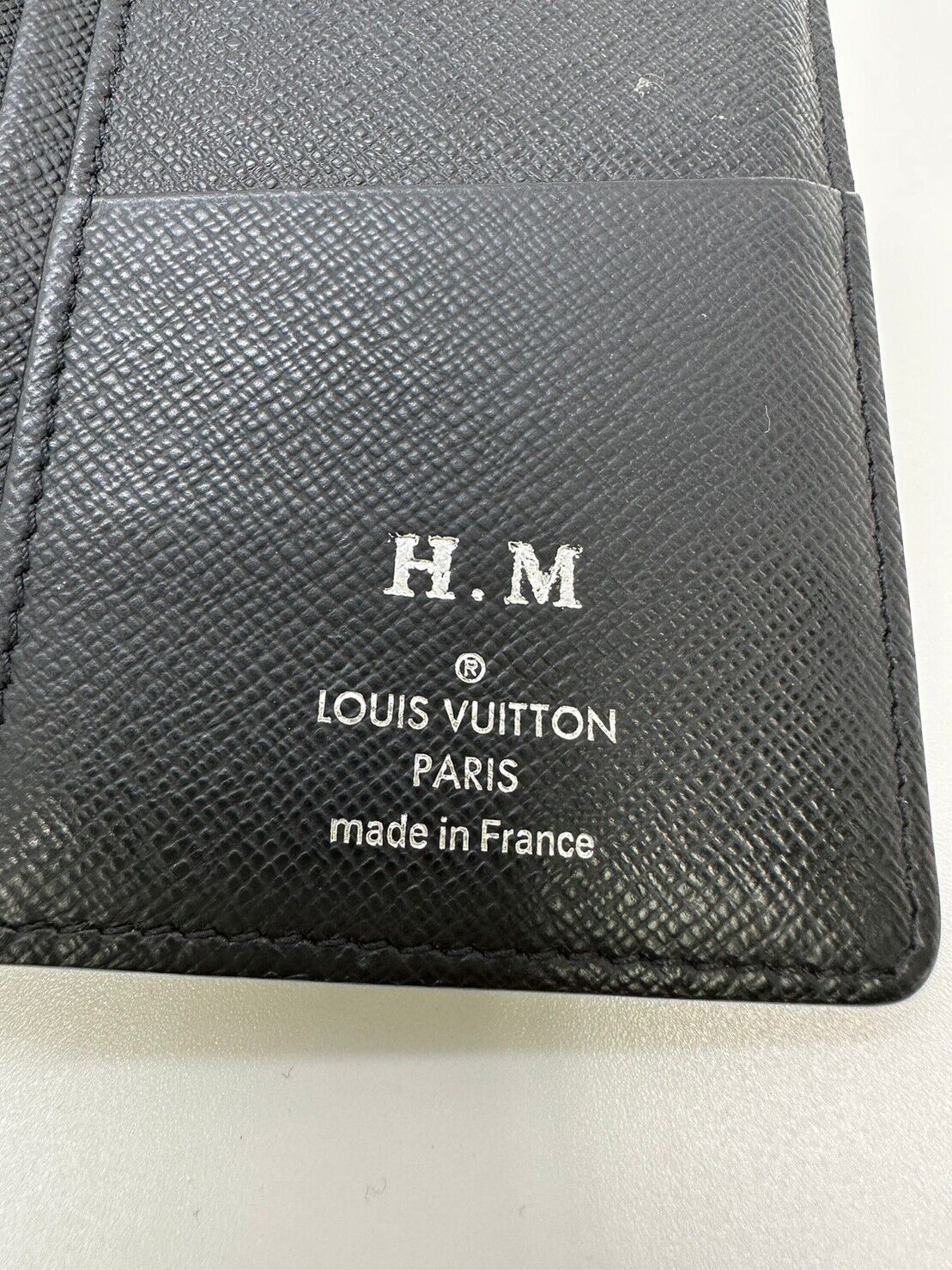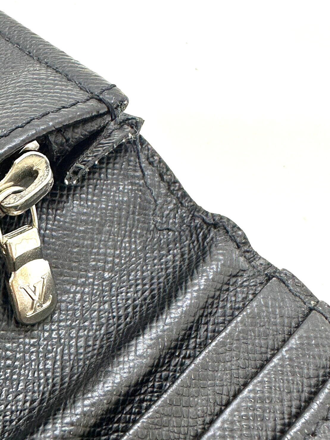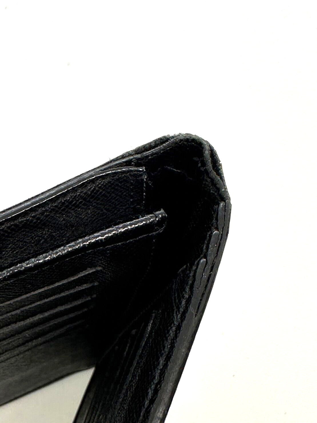 There are initials "H.M" on the inside. There are also wrinkles and sagging. The coin purse and free pocket are slightly stained. In addition, there are thread fraying on the top and bottom edges.